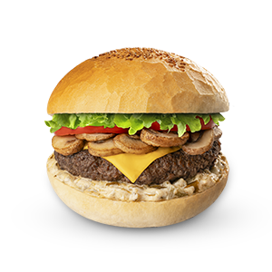 140 گرم گوشت گریل مغز ران گوساله حاوی گردو و ادویه مخصوص سرزمین سوخاری پخته شده به روش گریل، سس خیارشور، یک عدد پنیر ورقه‌ای گودا، قارچ، گوجه، کاهو، نان کلاسیک